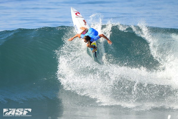 Putra Hermawan (IND), 20, was a late replacement for an injured Travis Logie (ZAF), 34, this morning and the young Indonesian made the most of his opportunity, eliminating Californian Brett Simpson (USA), 28, in the opening heat of the day. The young, Balinese natural-footer threaded a number of impressive barrels to secure the win, the first ASP WCT heat win in history for an Indonesian.